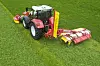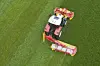 Du kan kjøre maskinen alene eller i kombinasjon med ei frontmontert. Summen blir seks meter ferdig slått og samlet gras i strengen.